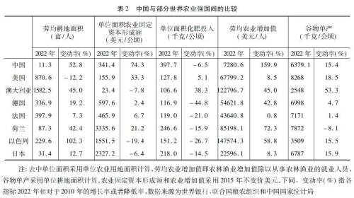 农业现代化道路与各国资源禀赋密切相关,人口密度大而土地资源极为稀缺的东亚国家,整体农业劳动生产率更低,建设农业强国的实现难度更大。结合中国具体国情来看,虽然受制于土地经营规模偏小的约束,但与德国、法国、荷兰、以色列、日本等国土体量相对较小国家的实现道路有明显不同,中国作为世界农业大国,要建设的是综合型农业强国。综合型农业强国首先能够依靠自身力量解决本国国民的粮食安全问题,在国际农产品贸易中占据重要地位,并且农业的各个部门、领域和主要环节都要强,这类国家以美国为典型代表。目前来看,具备建成综合型农业强国条件的有中国、俄罗斯、巴西、阿根廷、印度等农业大国,这些农业大国均为发展中国家。对比来看,中国的谷物、小麦、稻谷、花生、籽棉、茶叶、肉类、羊毛等粮食和农产品产量多年稳居世界第一,农业增加值的体量和增速也明显领先其他四国(表1)。2022年中国农业增加值是巴西和阿根廷总和的近11倍,是印度的2倍多,2010~2022年增速是俄罗斯和巴西的近2倍。2022年中国农产品进口额居世界第一位,出口额世界第四,已成为世界农产品大市场,农产品进出口总额高于其他四国总和。